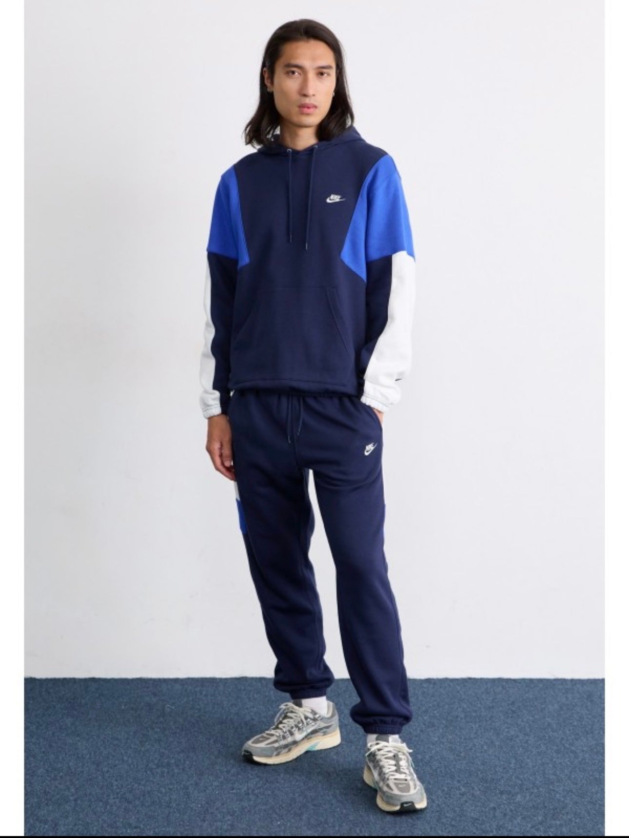 Tuta Nike Fleece Club in blu scuro con accenti blu chiaro e bianchi. Realizzata in morbido fleece, offre comfort e calore ideale per l'allenamento e il tempo libero. Il design classico Nike combina funzionalità e stile, con tasche pratiche e finiture di qualità. Perfetta per chi ricerca un capo versatile e durevole nel tempo.