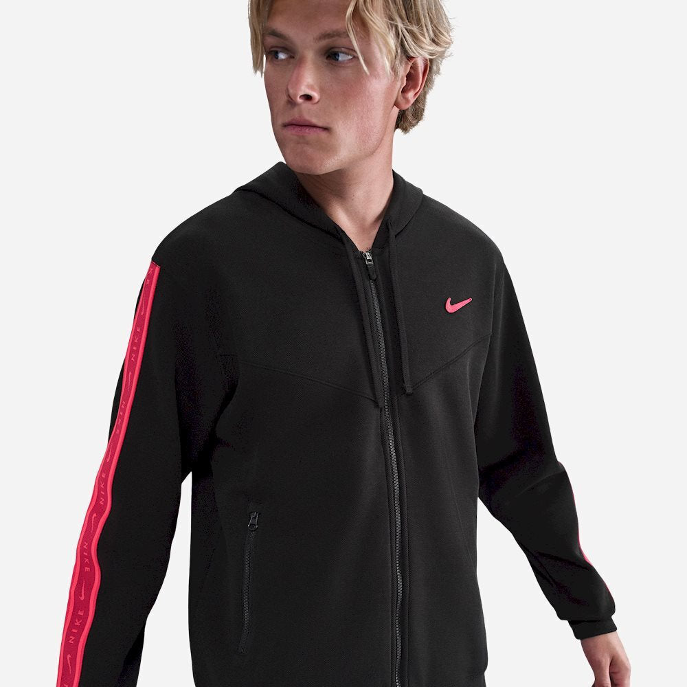 Tuta Nike Sportswear Club in nero con accenti rossi, perfetta per chi ricerca stile e comfort. Realizzata in tessuto morbido e traspirante, presenta una zip frontale pratica e un cappuccio strutturato. Il pantalone a palazzo garantisce una silhouette moderna e rilassata, ideale sia per l'allenamento che per il tempo libero. Dettagli rossi contrastanti esaltano il design sportivo. Un capo versatile che unisce funzionalità e estetica contemporanea.