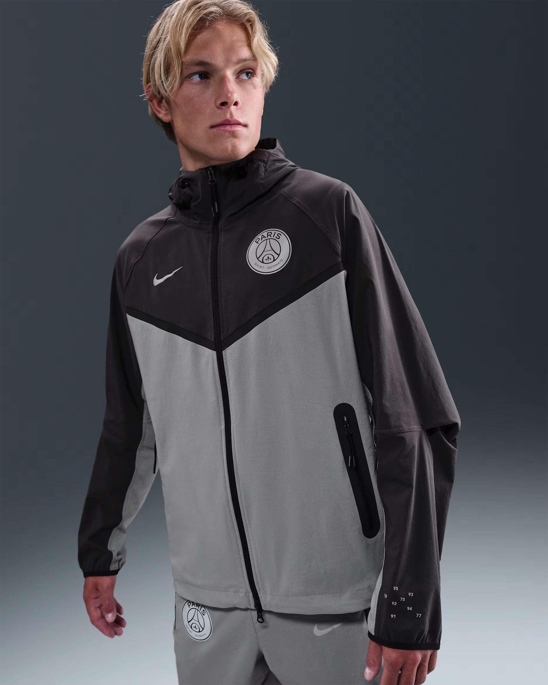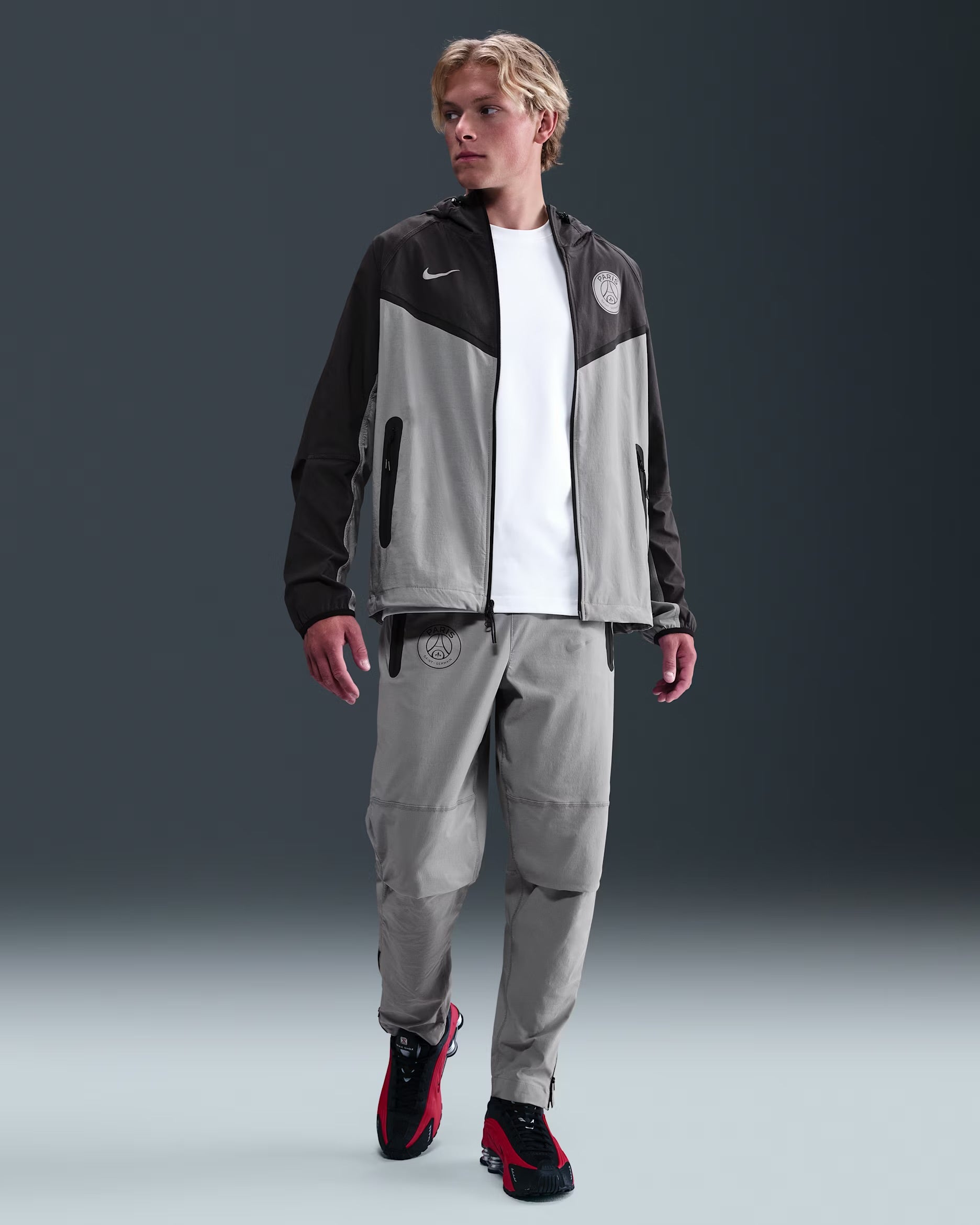 Tuta da ginnastica Nike Tech realizzata in collaborazione con il Paris Saint Germain, caratterizzata da una sofisticata combinazione di grigio e nero. Realizzata con tessuti tecnici innovativi, offre comfort e libertà di movimento per l'allenamento e l'uso quotidiano. Il design minimalista rispecchia l'eleganza del club parigino, mentre i dettagli ricercati garantiscono una vestibilità moderna e versatile. Ideale per chi ricerca qualità e stile in un'unica soluzione.